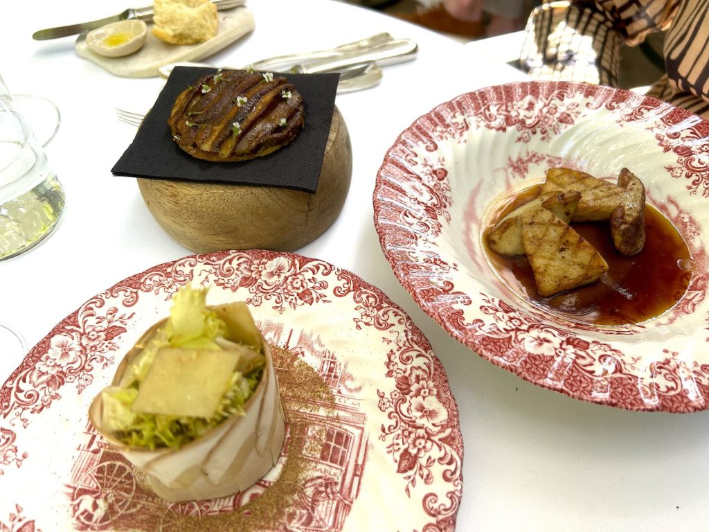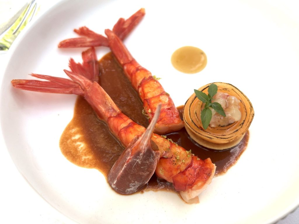 Ainsi la facture légère du cèpe grillé, son voile à l’estragon, salade de copeaux de cèpe au vieux parmesan et pissaladière de cèpe laqué au four. Puis la carabineros (langoustine à l’habit écarlate) simplement grillée, fleur de melon brûlé à la flamme, bisque de carabineros au bouillon de melon, tartare et tête farcie façon gratin.