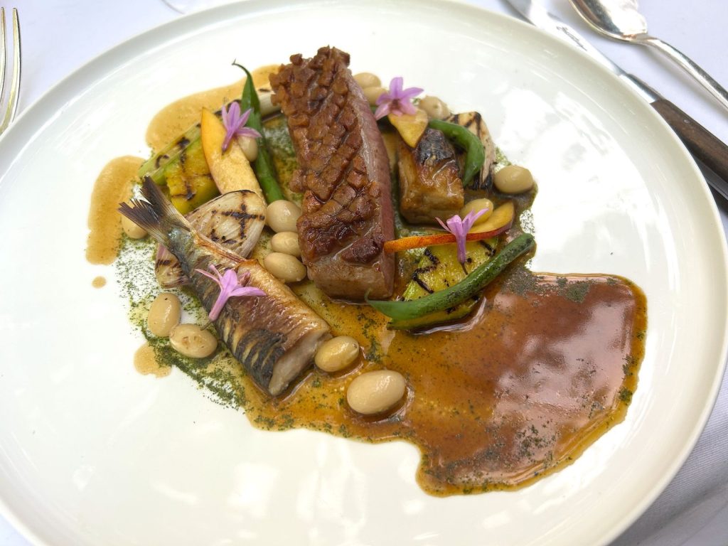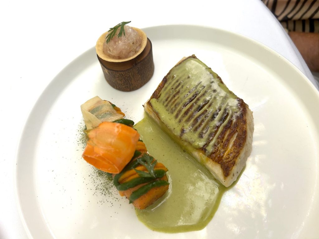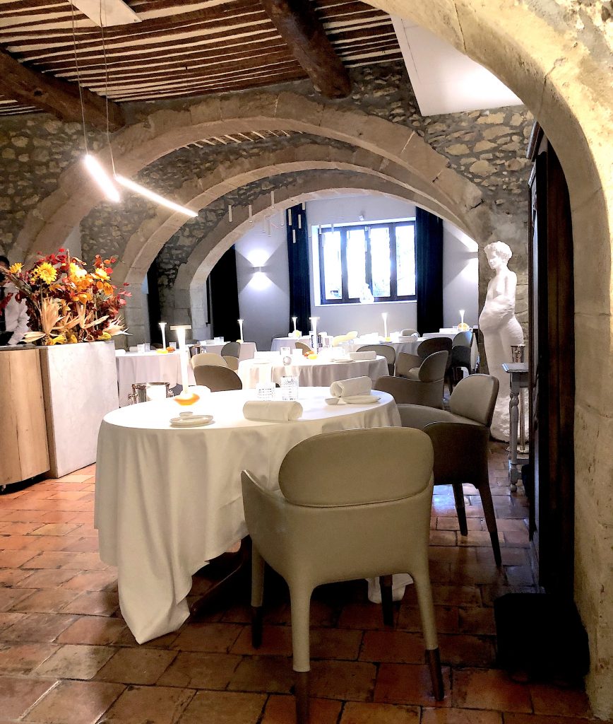 La carte s’ouvre sur la courgette fleur farcie à la truffe noire, huile de pistil, émulsion de courgette, une recette « signature », comme un marqueur en hommage à son créateur, bien connu dans la maison, Pierre Fulci. La suite tient la promesse initiale : le produit travaillé sous plusieurs angles, cuissons, accords, saveurs et textures… Une créativité sereine dans un décor du patrimoine.