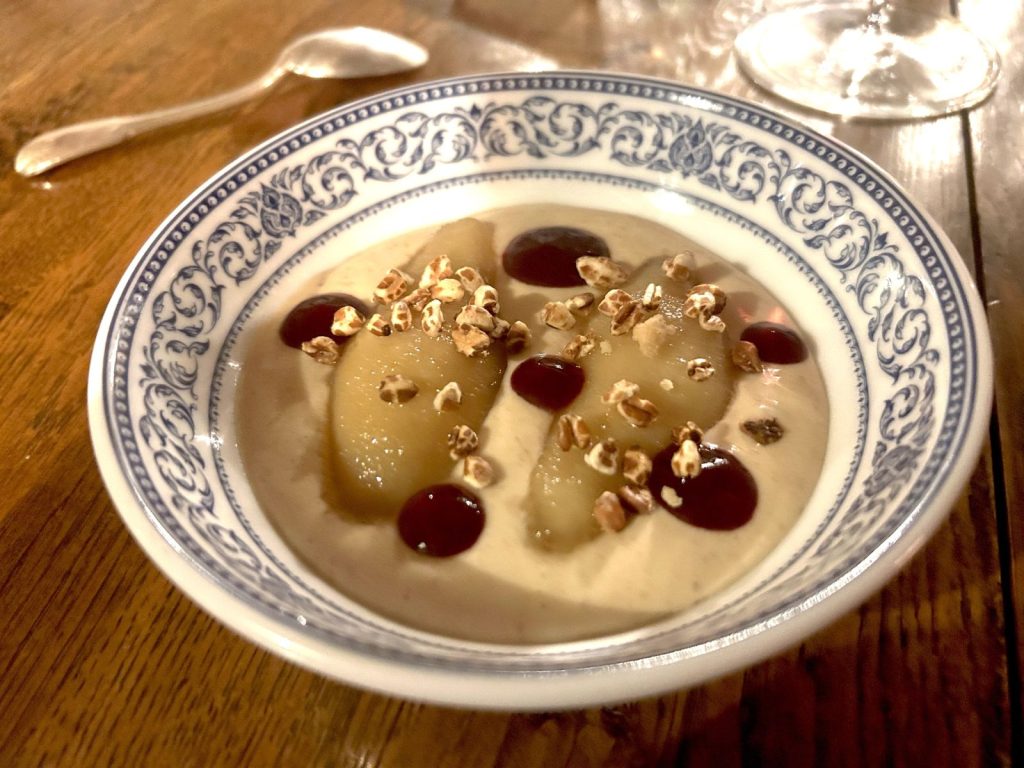 Les fromages sont – devinez – de la vallée de la Roya et il serait dommage de les ignorer : tomme de brebis brigasque, chèvre frais de Valérie, crémeux de Solange Pelissero… Enfin un dessert aux poires pochées au muscat, crème chiboust à la châtaigne de Saint-Dalmas de Tende, coulis prune et lavande, est une ultime douceur dans l’esprit de cette cuisine compréhensible et créative.