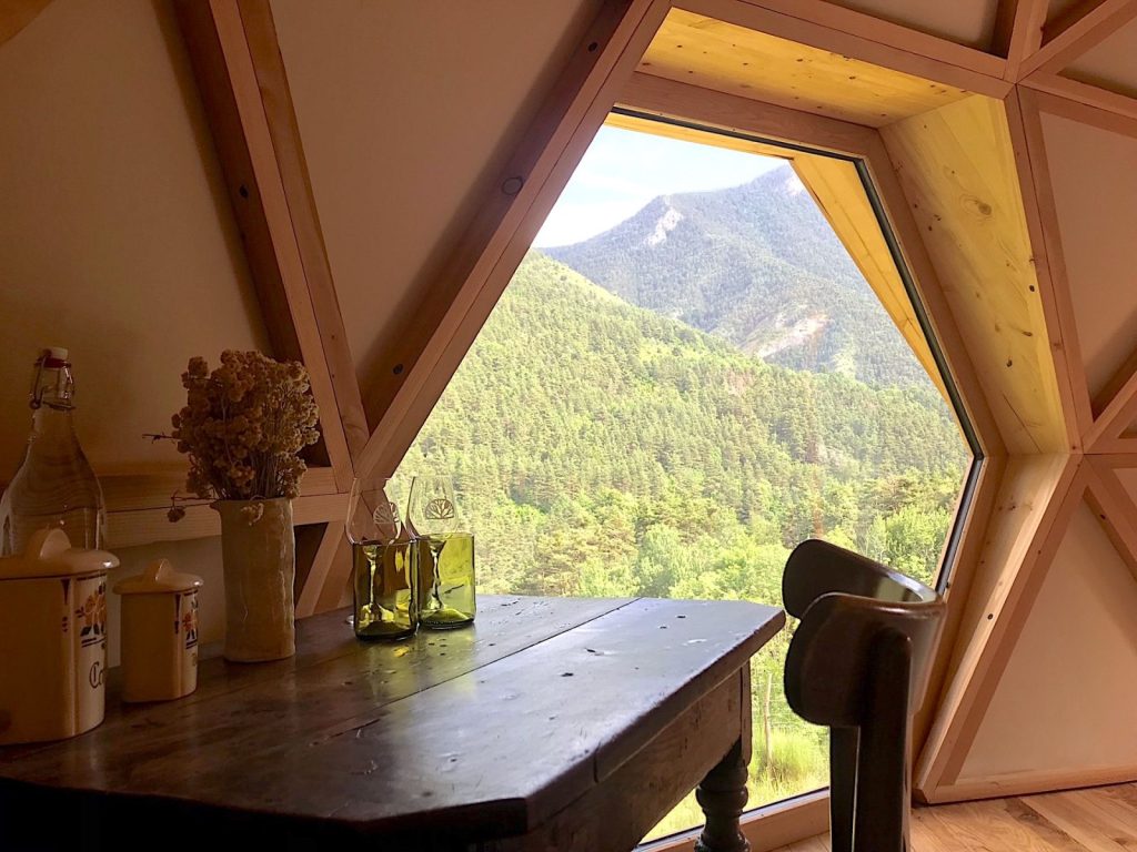 Et puis il y a l’hôtel, ou du moins son esquisse. En quelques marches taillées dans les restanques, on gagne deux dômes géodésiques aux chambres voyageuses et d’adorable confort. Camille et Thomas ont aménagé ces dômes mis au point par La Tanière à Mémé, entreprise spécialisée de Saint-Andéol dans le Vercors. Ils ont ainsi trouvé la formule magique pour offrir à leurs clients le spectacle d’un soir étoilé ou la fascination d’un ciel d’orage. Une réussite techno, la vue grand écran sur les montagnes et au matin, le petit déjeuner délicieux apporté par Camille avec pain au levain et farines anciennes, beurre fermier, miel, confitures, fromage de chèvre…