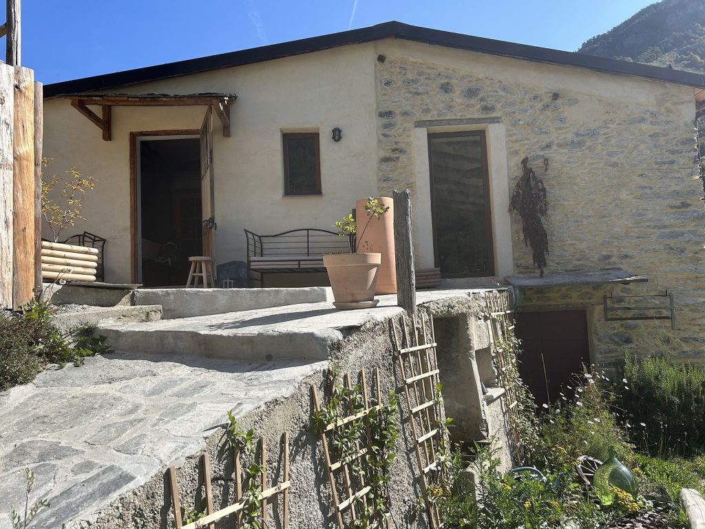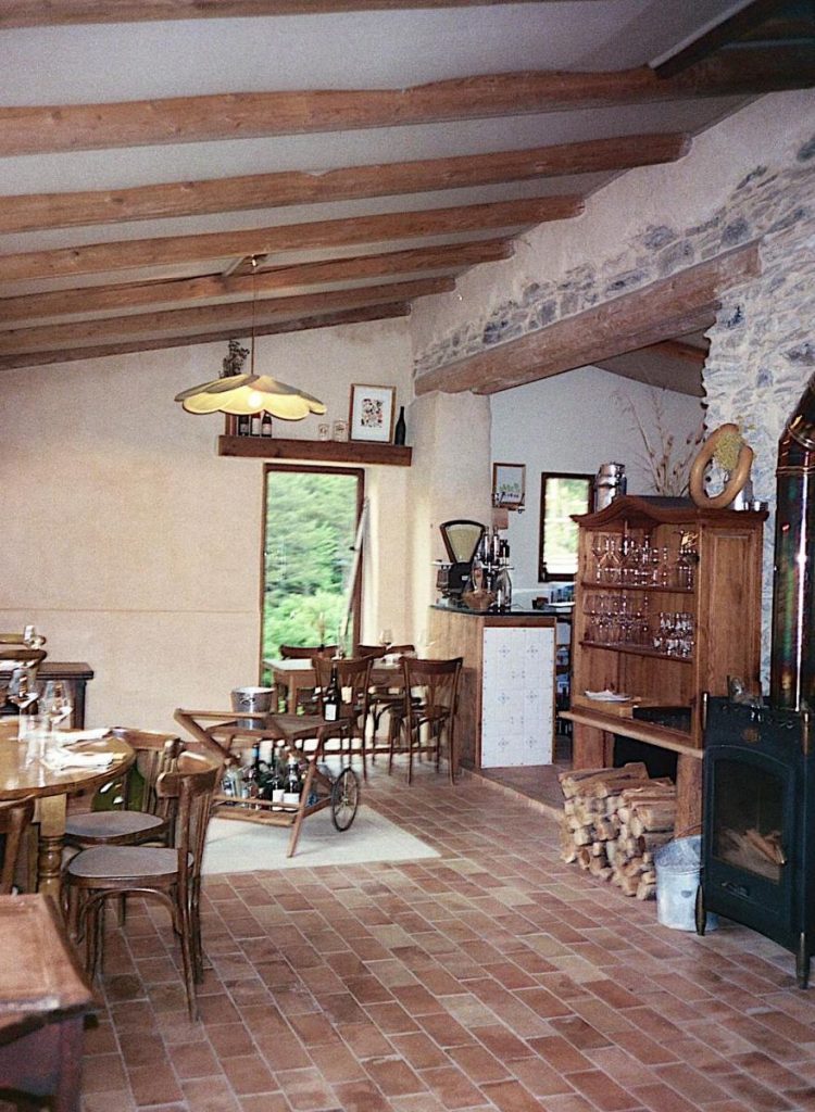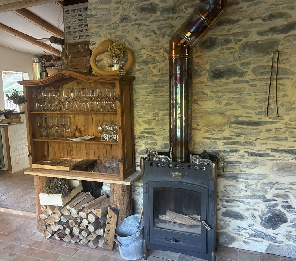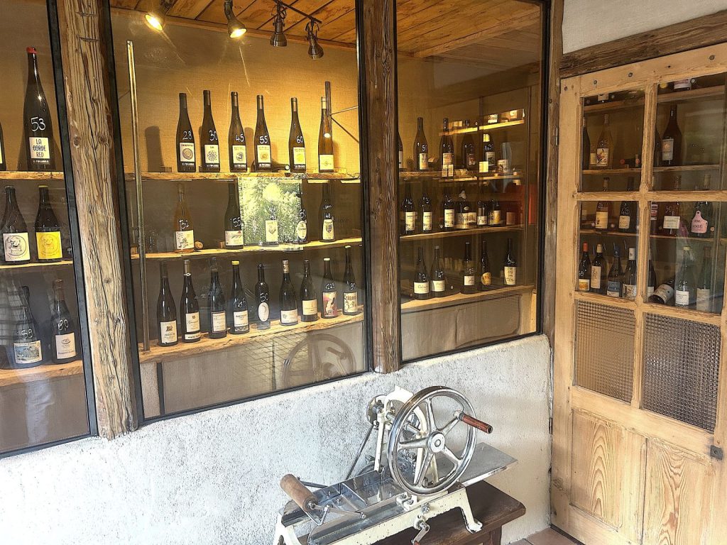 A une heure et demi de Nice, La Maison de la Pia peut paraître une destination insolite et lointaine mais son environnement préservé et jusqu’à l’identité culturelle de la haute Roya valent incontestablement le voyage. Pour l’atmosphère, on aime, à l’instant de l’apéritif, le temps suspendu sur la terrasse au voile de canisses et la vue sur les montagnes, puis la salle à manger aubergiste et la cuisine de Thomas qu’il a aménagée à sa main et où il officie en solo. Enfin, aussi essentielle et premier élément du décor, la bibliothèque vitrée et sa collection de vins «nature» dans laquelle Camille puisera au moment d’annoncer, à la table, le détail des menus et l’inspiration du jour.