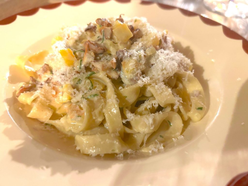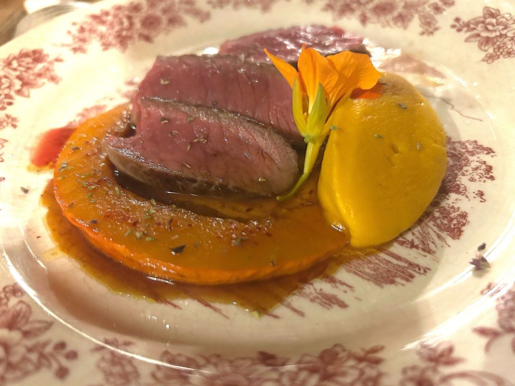 Une assiette de partage ? La voici, clé de voûte du menu avec les pâtes fraîches aux oeufs de la Ferme Lamentarghe, du vallon voisin, tomates, crème d’alpage et champignons « pieds de mouton ». Un plat précis, savoureux, quand on l’imaginait familier et désordonné, au hasard de la pasta. Puis la noix de veau d’Aubrac à la cuisson exacte, purée de carottes à l’harissa de La Brigue et potimarrons rôtis.
