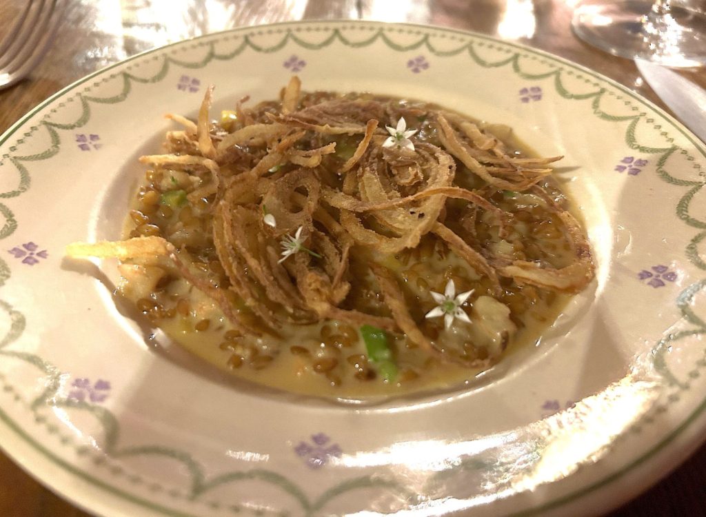 Dès les amuse-bouche, socca, tomates «ananas» du jardin et fleurs d’origan séchées, une délicatesse s’installe. L’assiette est généreuse, tel ce plaisir terre-mer, un risotto d’orzo (petites pâtes de blé), bouillon de veau d’Aubrac et crevettes sauvages de San Remo.